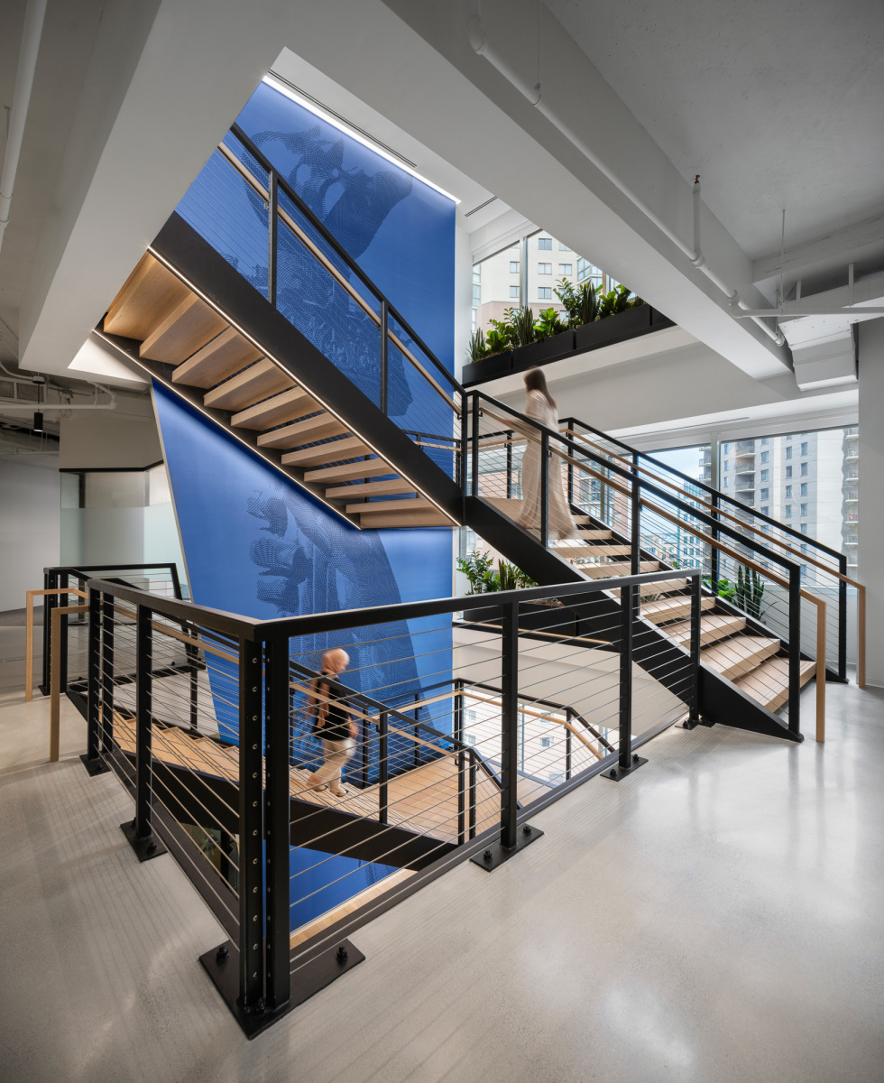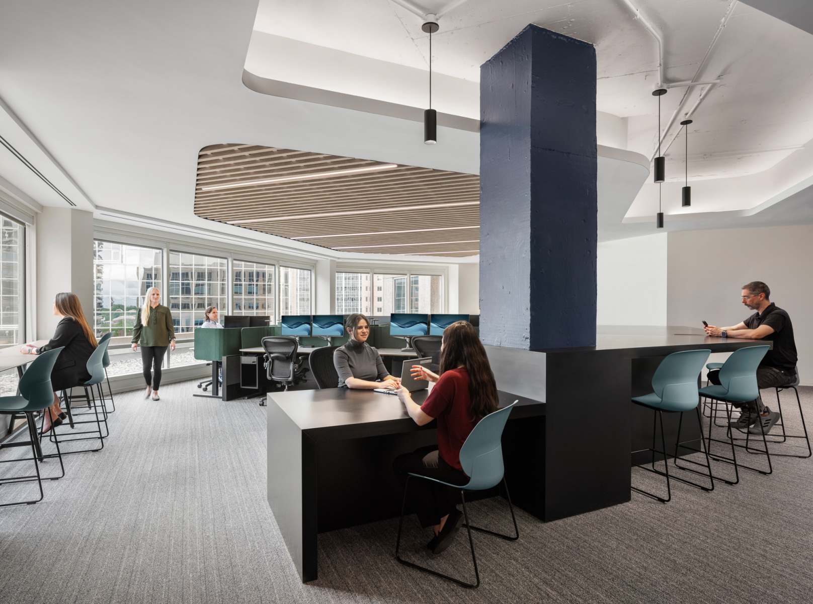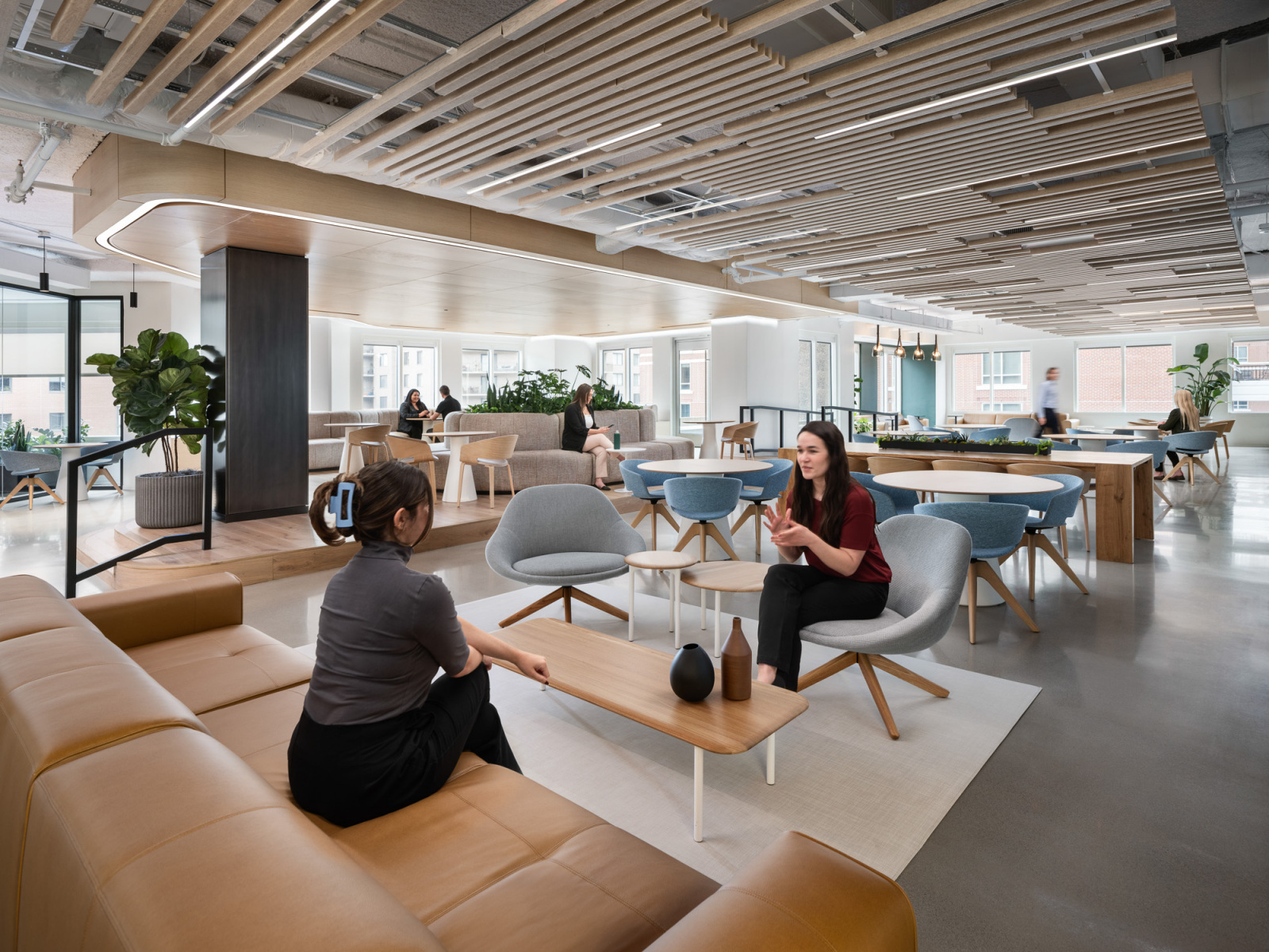 A highend interior build-out spanning five floors, totaling approximately 180,000 SF. The design for the three upper floors includes an interconnecting stair, a town hall area featuring raised platform wood flooring, a renovated roof terrace, a new board room, and several offices and conference rooms equipped with new demountable fronts.