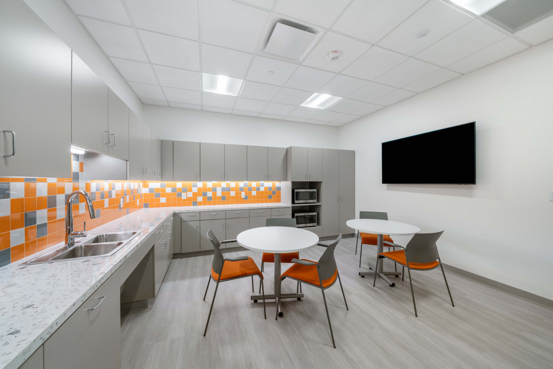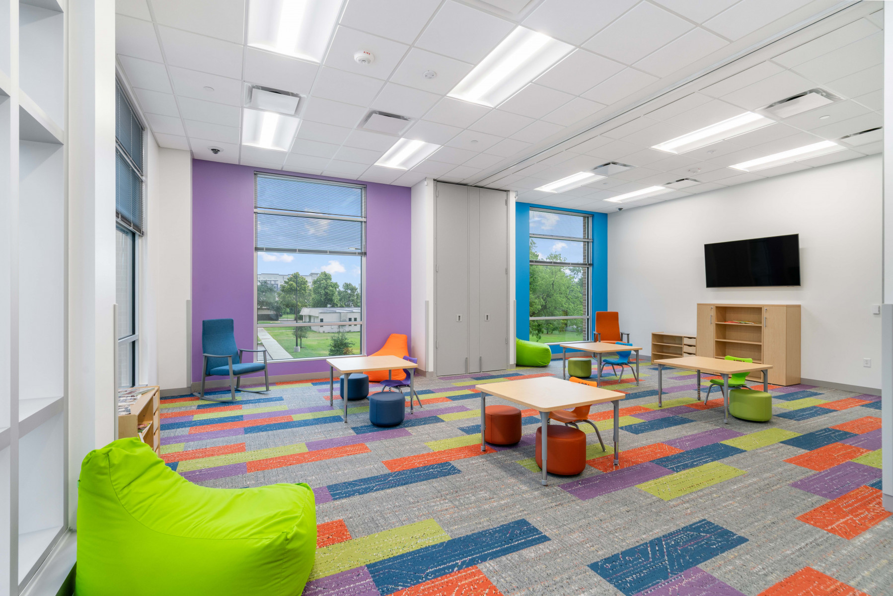 The interior finishes comprise various materials, including carpet, luxury vinyl tile (LVT), ceramic tile, polished concrete floors, paint, laminate-clad wall panels, storefront glass, and acoustic ceiling tiles (ACT), which collectively create a welcoming and functional environment. Notable design elements include operable partitions that allow for flexible space utilization, polished concrete floors that enhance the modern aesthetic, and glass donor walls that serve as inspirational displays.