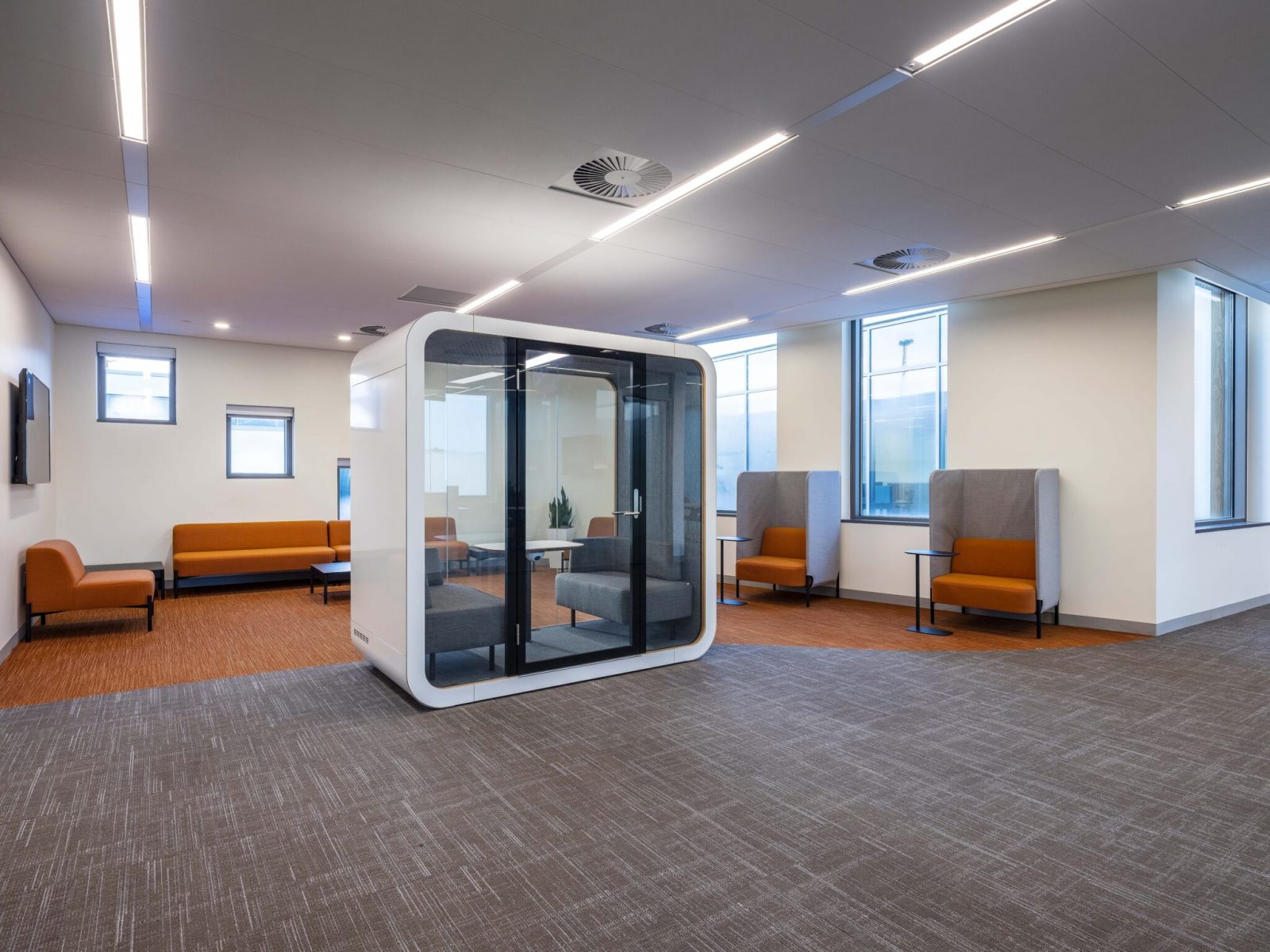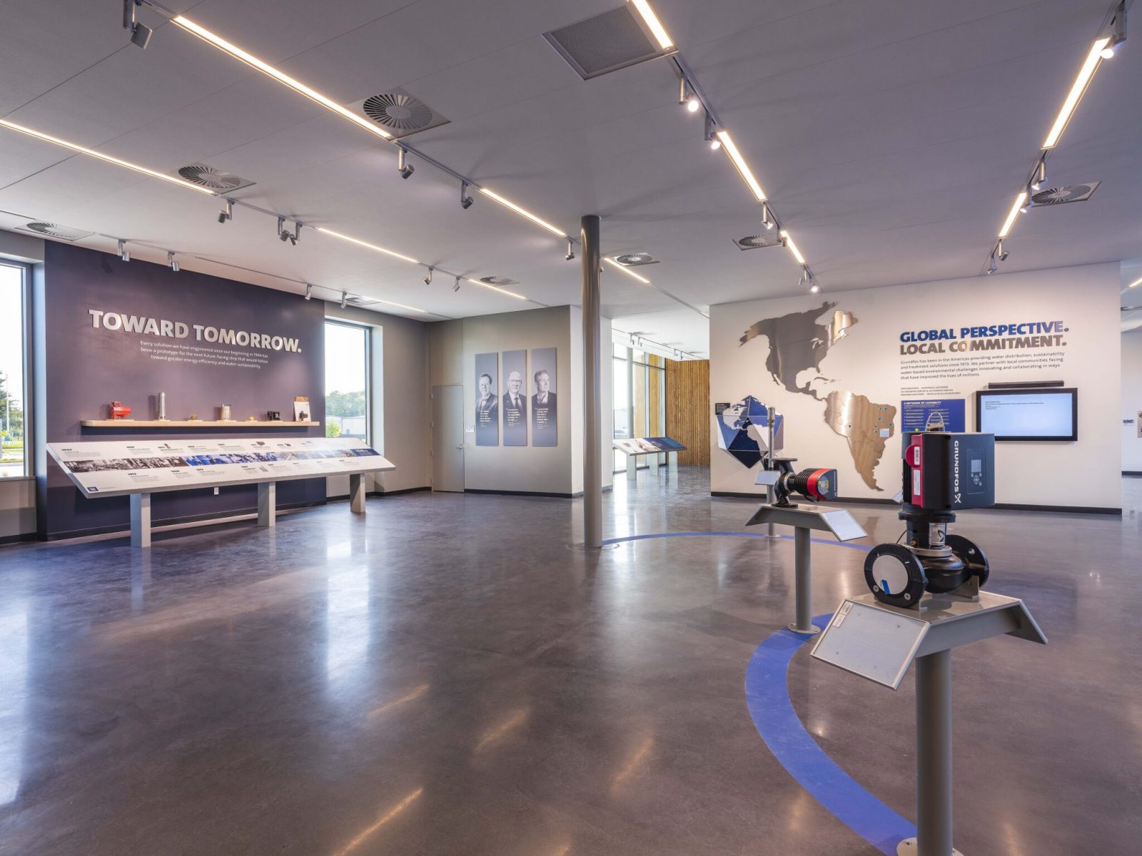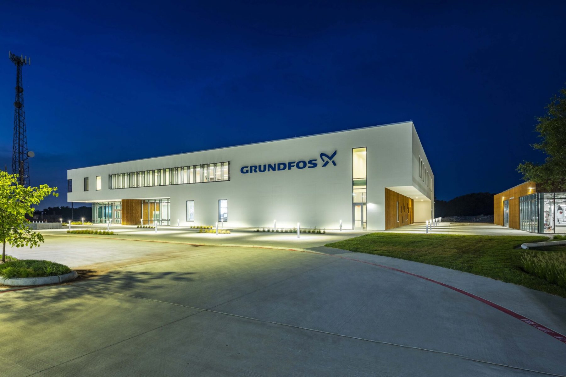 The Grundfos Headquarters project consists of two buildings: a 50,000 SF office and administrative building and a 4,000 SF technical building. The office and administrative building include a showroom space and exhibition area. The project is a true design-build, with Harvey Cleary holding all the consultant contracts and the design-build for the MEPF systems. The ownership team described the project as the “Ferrari” of corporate headquarters because of the building’s unique and custom features. The unusual LEED components include 20% solar power for the building, twin underground rainwater collection tanks, twin chillers, a solar-powered boiler, AQ Pure water filtration system, exception envelope leakage reduction, and enhanced indoor air quality control.